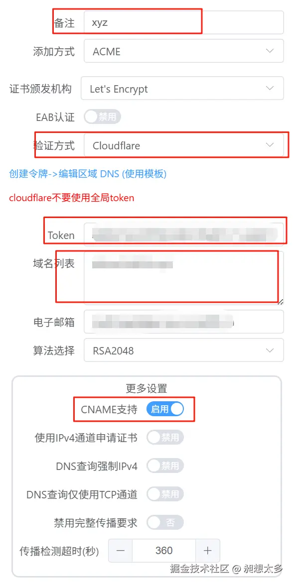 配置证书相关信息,按照图示填写自己的域名信息,红框出为必填,其它可选。由于我的域名托管到 Cloudflare,此处以 Cloudflare 为例。