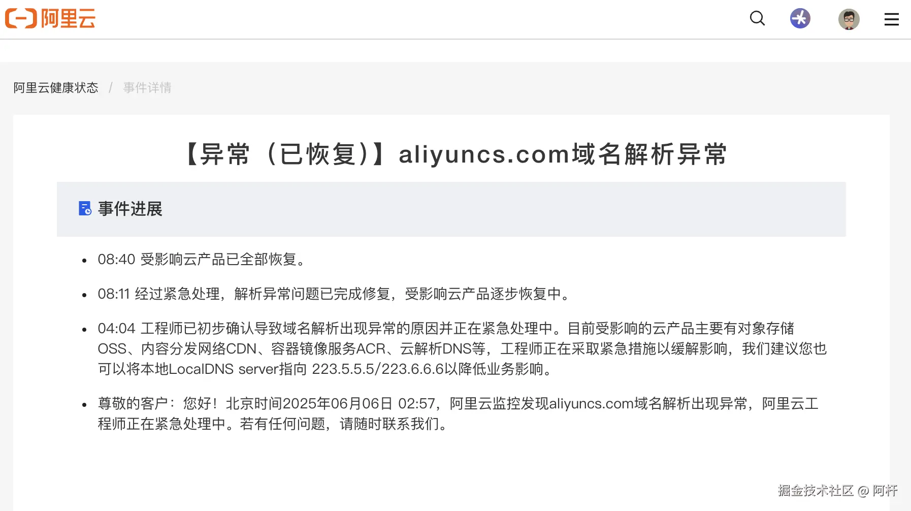 阿里云健康状态事件详情:status.aliyun.com/#/eventDeta…