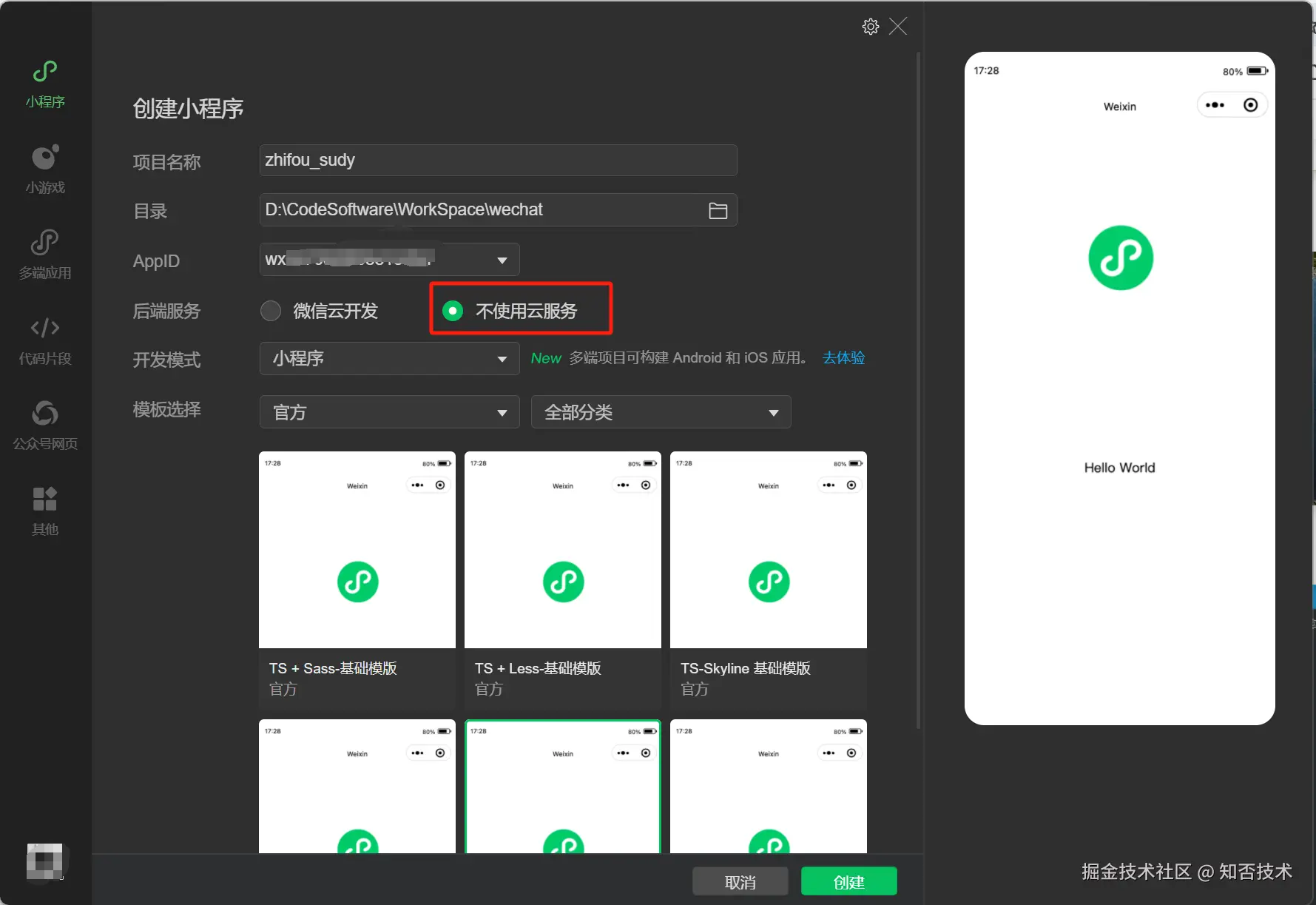 输入项目名,下拉选择小程序的 AppId。后端服务选择不使用云服务,因为云服务需要花钱购买微信官方的云服务。当然如果你是学习使用,可以免费使用一个月云服务。