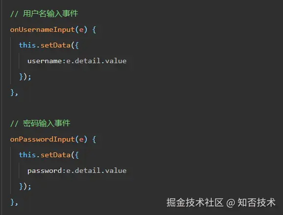 微信小程序是单向数据流,所以当输入账号和密码时需要手动更新 js 中 dada 里面的数据。