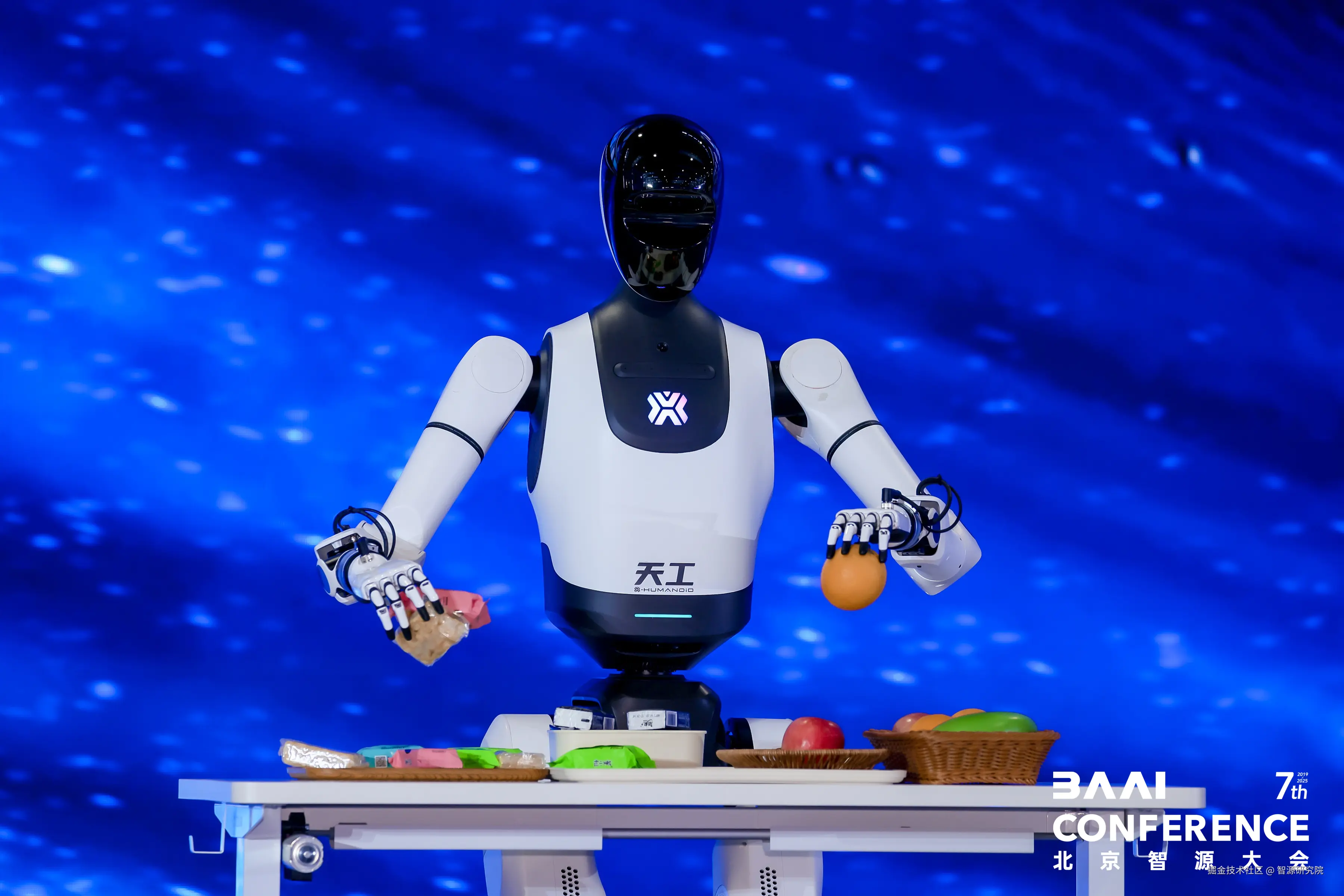 在智源具身智能会客厅中,银河通用的具身大模型机器人Galbot登台展示了端到端VLA大模型在商业零售场景的落地应用, 《CMG世界机器人大赛·系列赛》机甲格斗擂台赛“AI策算师”冠军机器人宇树G1登台展示了敏捷帅气的“组合拳”,全球首个人形机器人半程马拉松冠军天工2.0也参与了现场互动,完成“水果摆盘”的精细化服务任务,获得满堂喝彩。