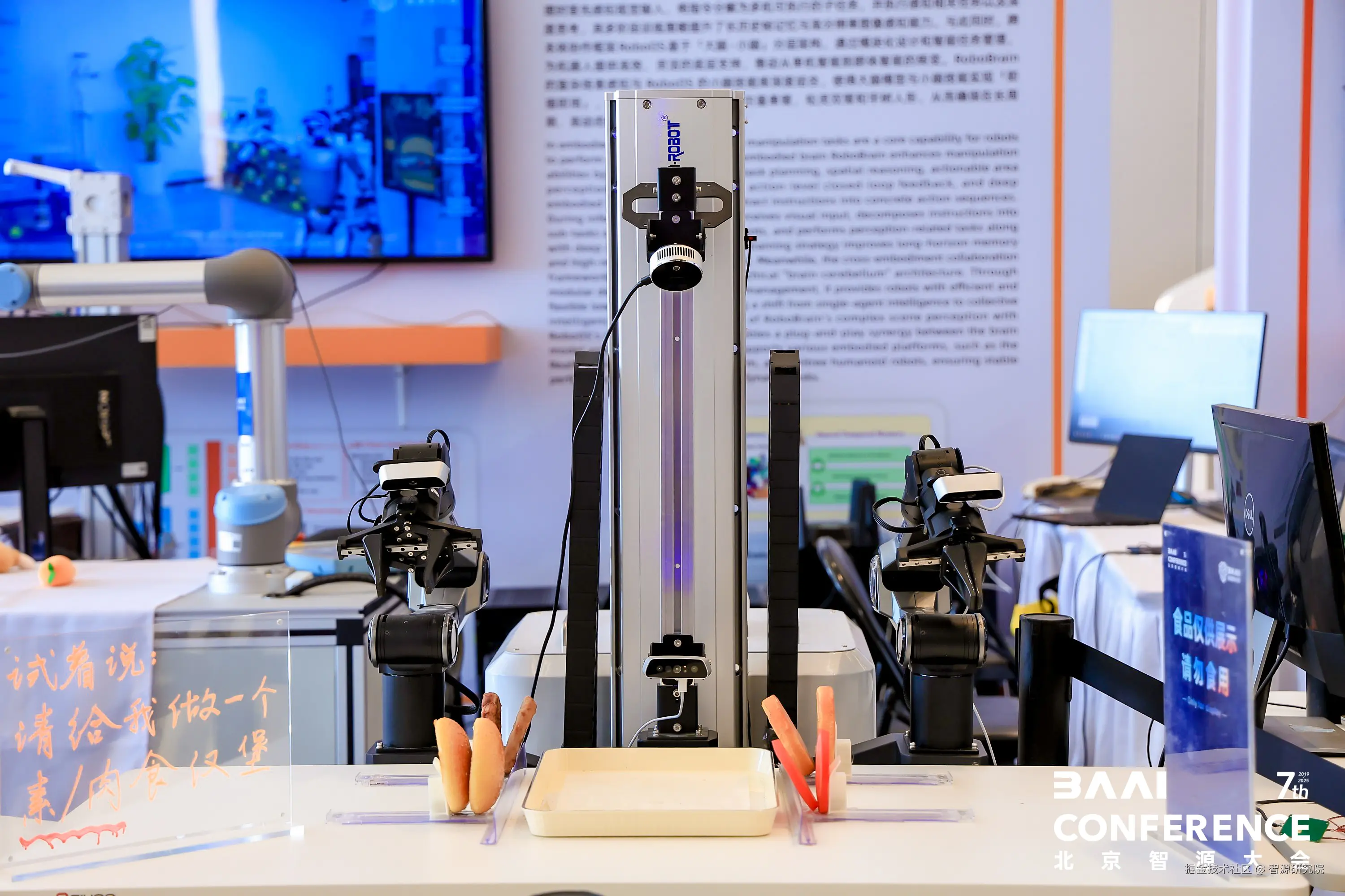 在具身智能展区,基于RoboOS 2.0以及RoboBrain 2.0的不同构型的机器人(单臂、轮式双臂、人形) 带来了丰富的技能展示,包括餐饮互动,机器人接受到语音指令后,完成汉堡制作和倒饮料的动作,以及抓娃娃的游戏和家居物品收纳。此外,基于智源自主研发的多模态具身大模型的机器人,融合了视觉、听觉、思考、语音交互等能力,带来了“心有灵犀”的互动小游戏,机器人可对看见的物品进行详细描述,互动者依据信息线索猜出对应的物品名称。智源与银河通用联合研发的具身大模型机器人Galbot,展示了商超场景下的落地应用能力。