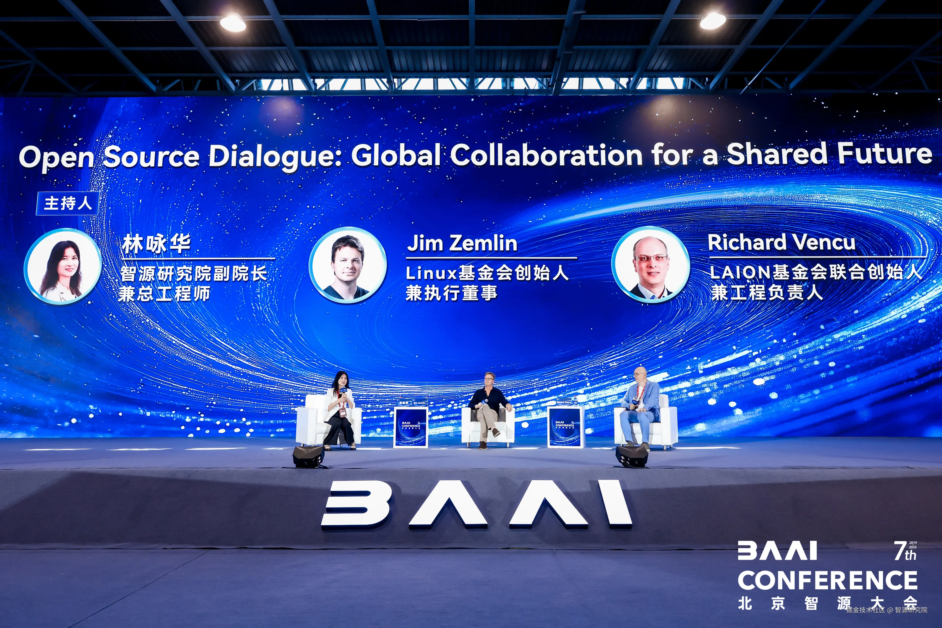 智源研究院副院长兼总工程师林咏华主持Fireside Chat,Linux基金会执行董事Jim Zemlin 与LAION工程负责人兼创始人Richard Vencu就全球AI开源与合作展开深度对话,嘉宾普遍认为,开源是 AI 发展的核心,数据集共享是关键基础,全球合作至关重要,应当鼓励开发者从提交代码等小事参与开源,共同推动 AI 创新。