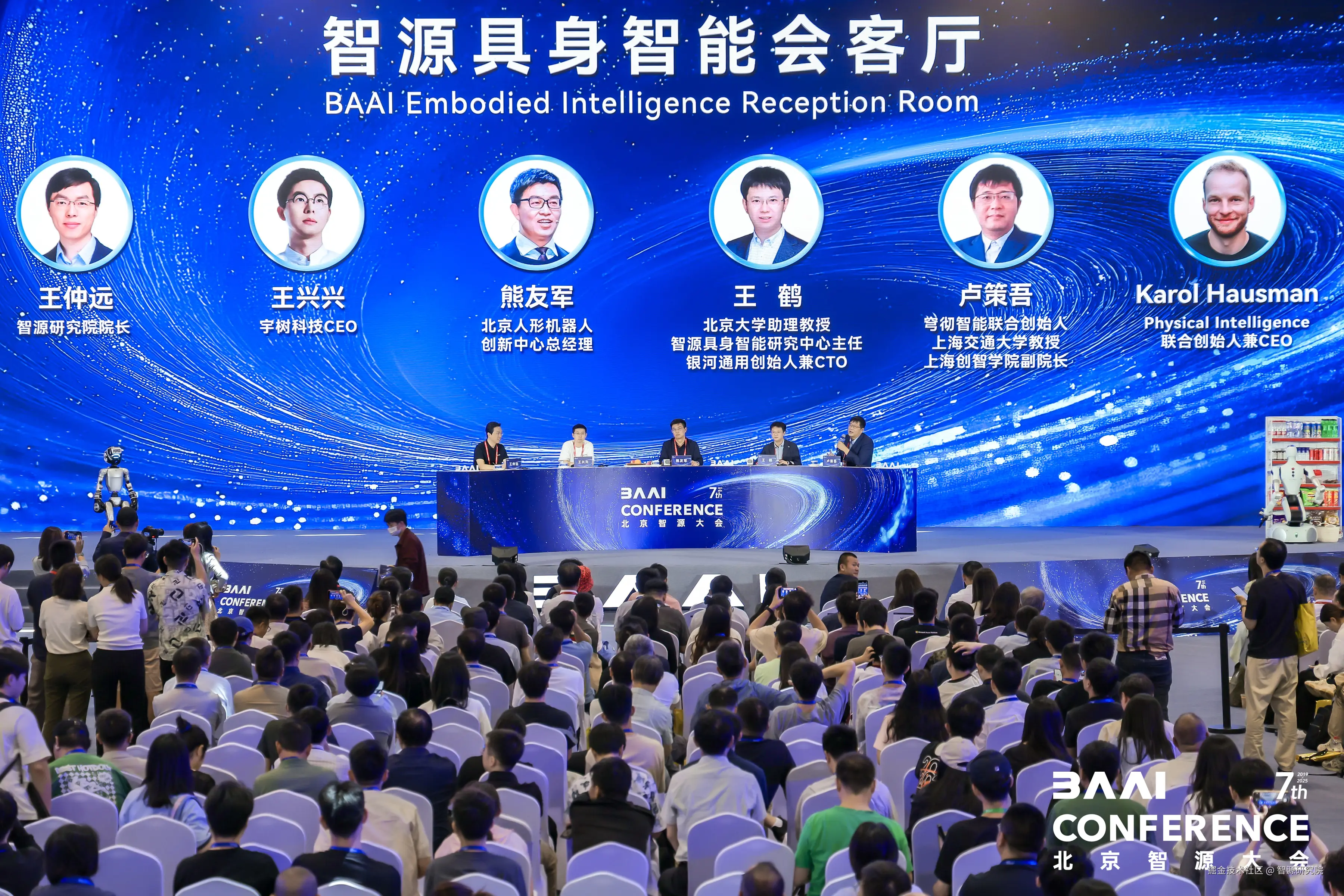 在对具身智能发展满怀期待的氛围中,智源研究院王仲远与Physical Intelligence联合创始人兼CEO Karol Hausman,宇树科技创始人王兴兴,银河通用创始人兼CTO、北京大学助理教授、智源具身智能研究中心主任王鹤,穹彻智能联合创始人、上海交通大学教授卢策吾,北京人形机器人创新中心总经理熊友军,就具身智能的不同技术路线、商业化路径探索、典型应用场景拓展、产业生态构建等议题展开深度讨论。嘉宾认为,短期内人形机器人因数据采集、人机交互和环境适应优势是重要载体,长期看随着 AGI 发展会多样化。对于 VLA 模型泛化性,虽面临机器人环境复杂等挑战,但通过合成数据、多场景训练等可提升适应性。