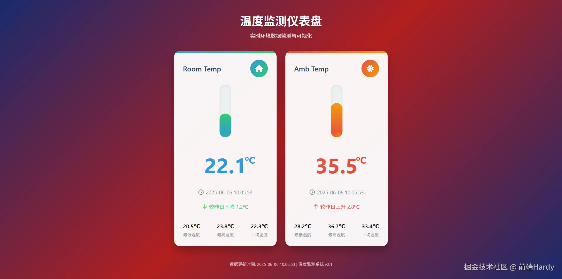 这个页面实现了一个温度监测仪表盘,包含两个卡片分别显示室温和环境温度。每个卡片都有独特的颜色主题和动画效果,页面使用了 CSS 渐变和阴影来增强视觉效果。