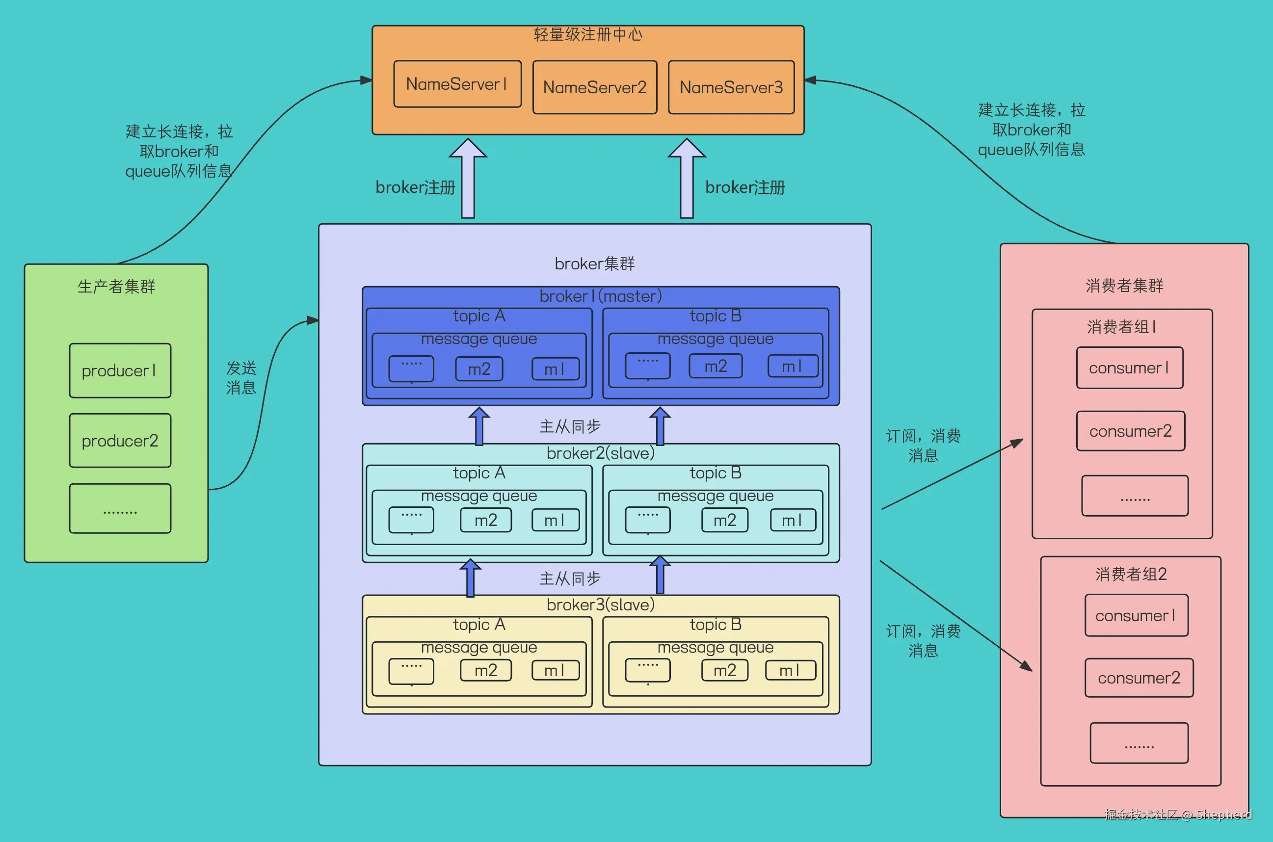 、topic、message queue和路由信息`等等,可集群部署。每个 Broker 在启动的时候会到 NameServer 注册,Producer 在发送消息前会根据 Topic 到 NameServer 获取到 Broker 的路由信息,Consumer 也会定时获取 Topic 的路由信息。 - Broker:消息中转角色,负责存储消息,转发消息。分为Master Broker和Slave Broker,一个Master Broker可以对应多个Slave Broker,但是一个Slave Broker只能对应一个Master Broker。Broker启动后需要完成一次将自己注册至Name Server的操作;随后每隔30s定期向Name Server上报Topic路由信息