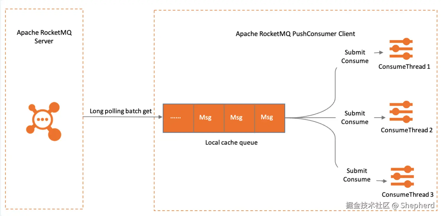 PushConsumer 是一种高度封装的消费者类型。消息消费和消费结果提交仅通过消息监听器进行处理。消息获取、消费状态提交和消费重试由RocketMQ 客户端 SDK 完成。一开始我差点以为它是一条一条消息的消费,这样消费也太慢了吧?设计这个消费者意义不大呀