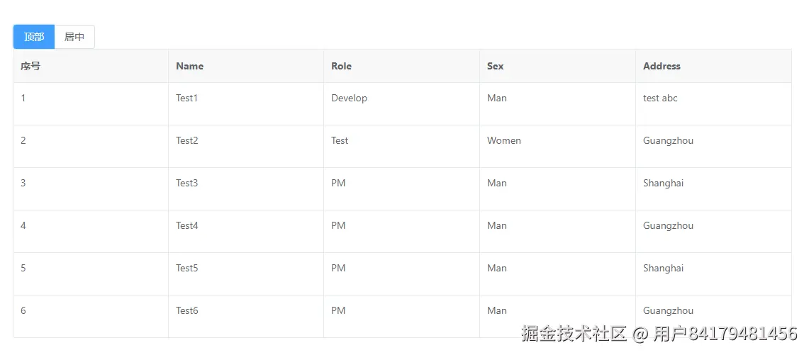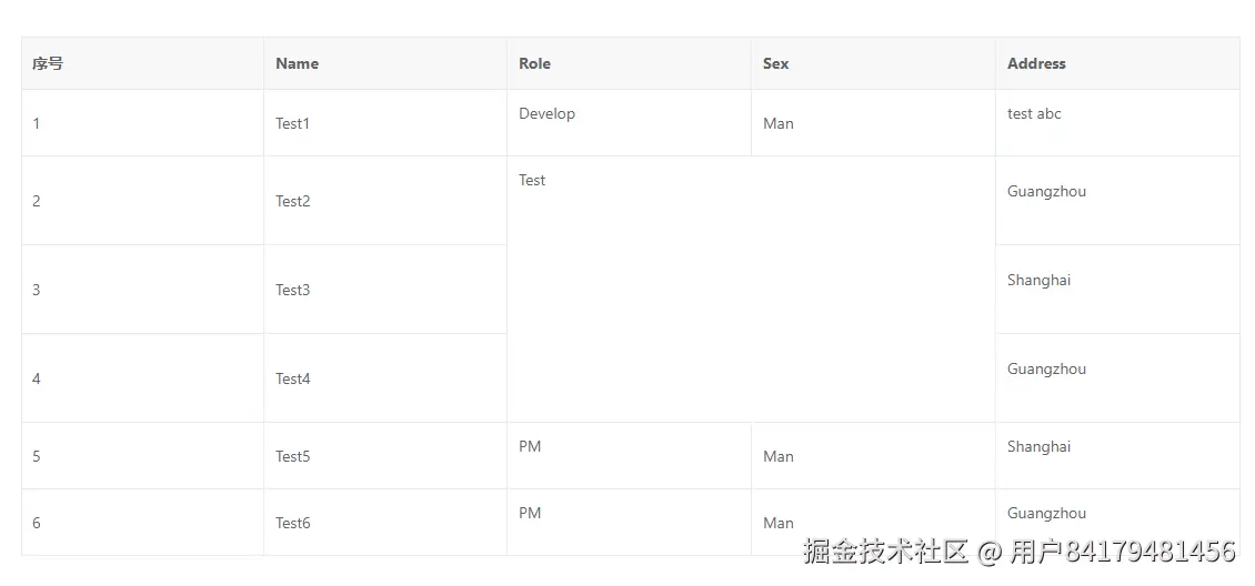 { id: 10006, name: 'Test6', role: 'PM', sex: 'Man', age: 38, address: 'Guangzhou' }