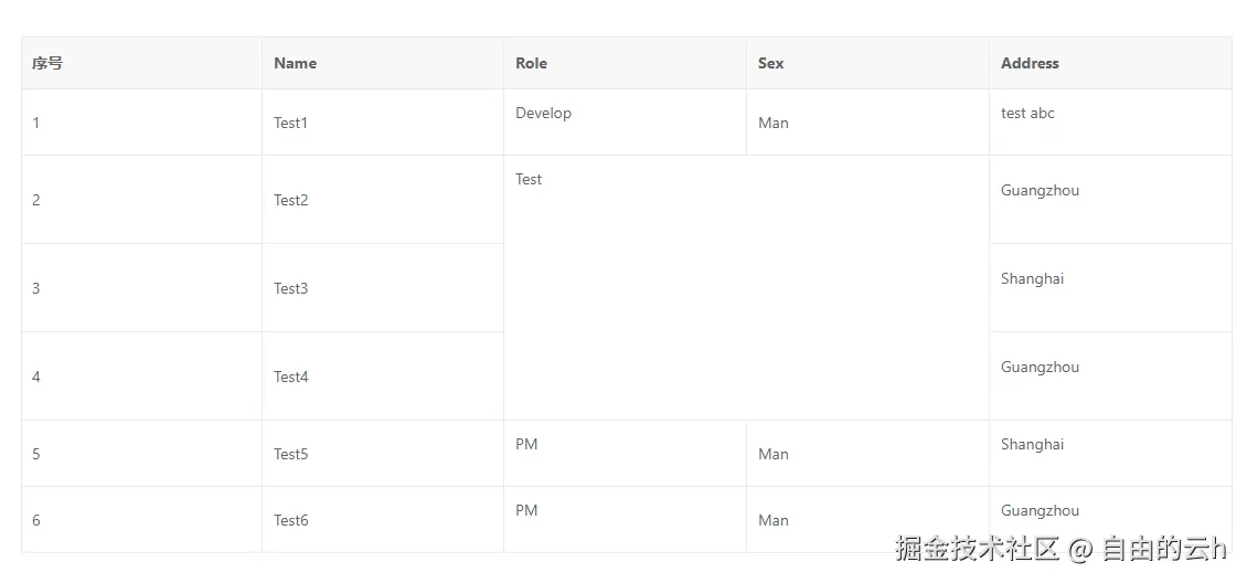 { id: 10001, name: 'Test1', role: 'Develop', sex: 'Man', age: 28, address: 'test abc' },