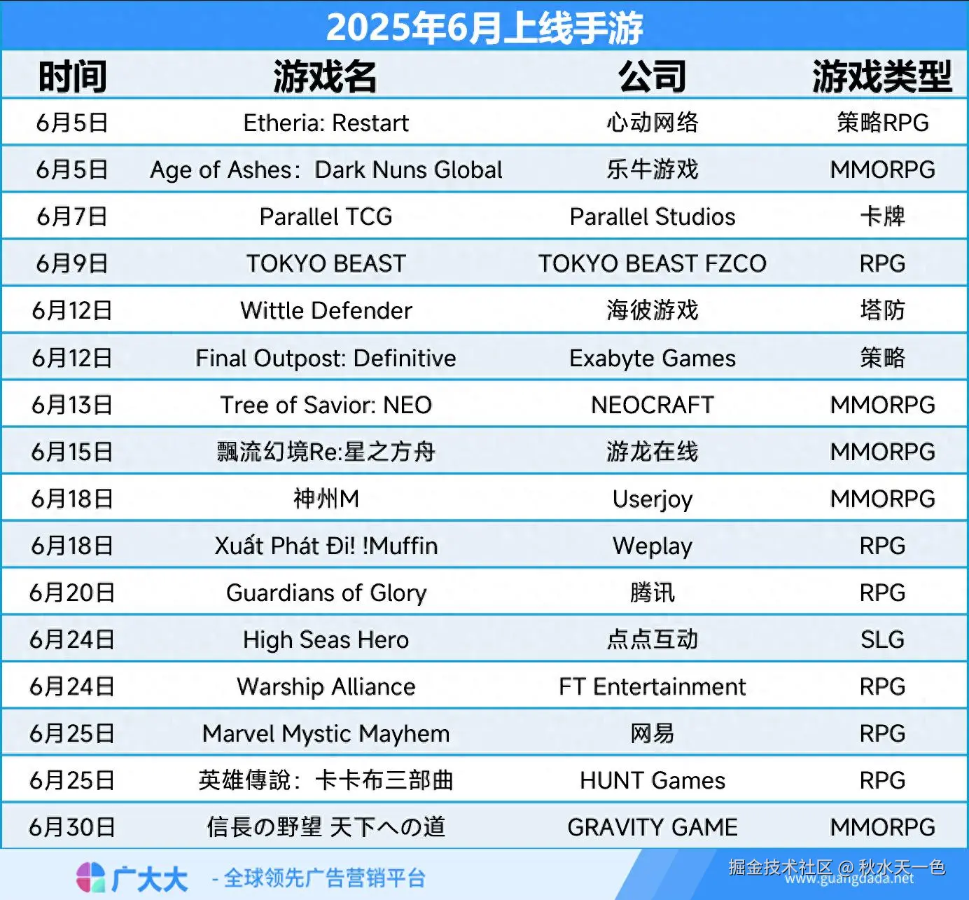 广大大数据研究院根据广大大-预约日历功能,筛选收集了总计16款2025年6月上线手游。