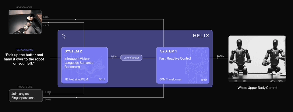 Helix 是 Figure 与 OpenAI 分道扬镳后的第一个成果,是一个适用于通用人形机器人控制的端到端 “视觉 - 语言 - 动作” 模型_(VLA)_,能让机器人像人一样感知、理解和行动。