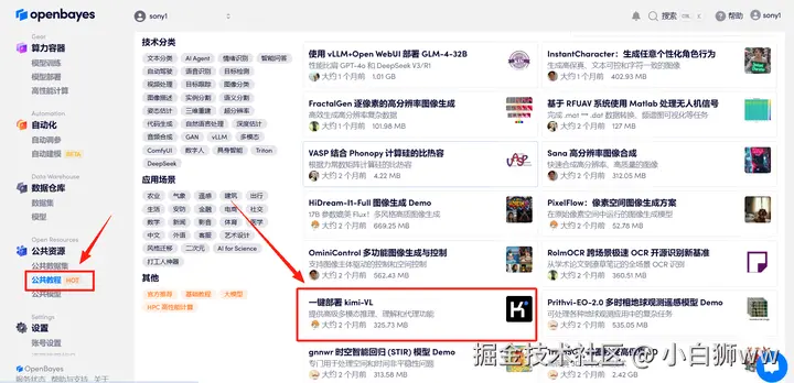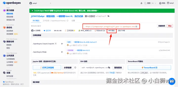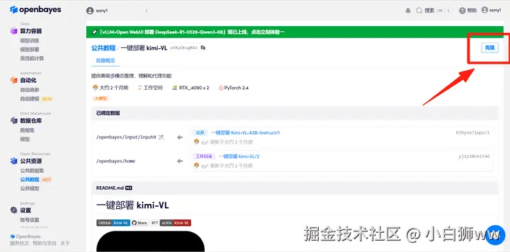 本教程采用资源为双卡 RTX 4090 。 教程链接:go.openbayes.com/50NqC 使用云平台: OpenBayes openbayes.com/console/sig… 首先点击「公共教程」,在公共教程中找到「一键部署 kimi-VL」,单击打开。