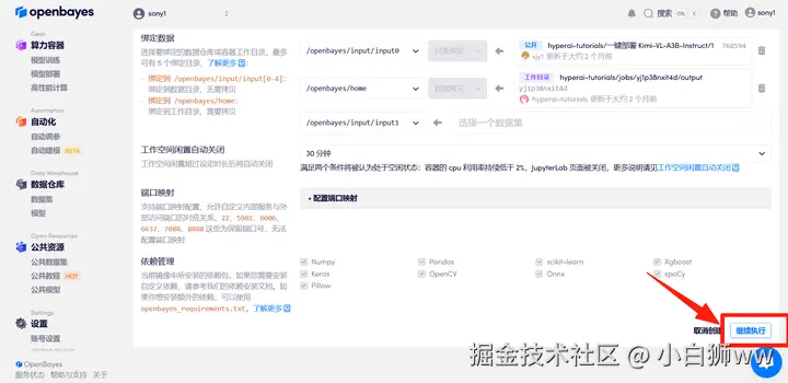 在当前页面中看到的算力资源均可以在平台一键选择使用。平台会默认选配好原教程所所使用的算力资源、镜像版本,不需要再进行手动选择。点击「继续执行」,等待分配资源。