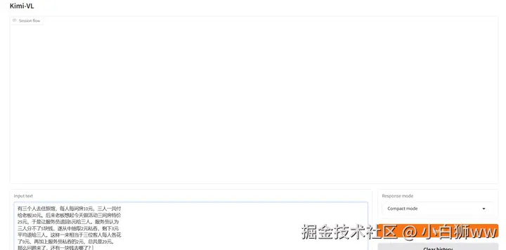 打开模型后,向它提问一道比较绕的数学谜题,可以看到,Kimi-VL 不仅快速的提供了最终答案还呈现了分步的思考过程。
