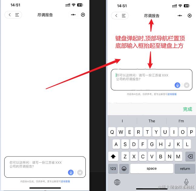 在微信小程序中,常见的页面布局是顶部导航栏和底部输入框固定不动,中间内容部分自适应。但是当键盘弹起时整个页面被挤压,导致元素上移或被覆盖,业务希望在这种情况下,输入框能自动抬起至键盘上方,顶部导航栏保持固定,不被顶上去。效果如图所示: