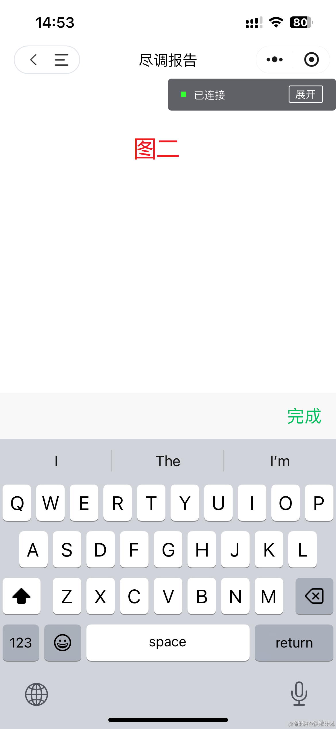 方案2:直接在textarea组件中设置adjust-position="{{false}}",这样当键盘弹起时,虽然顶部导航栏固定不动,但是底部输入框被键盘遮挡,效果如图二: