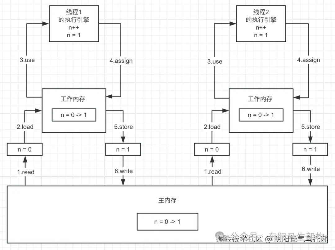 比如increase()方法只有一行代码,用javap反编译可知由4条字节码指令构成。当get_field指令把n的值取到操作栈顶时,volatile保证了n的值此时是最新的。但线程1执行iconst_1、iadd这些指令时,线程2可能已经把n的值改变了。于是此时线程1的操作栈顶的n值,就变成了过期数据,所以线程1执行put_field指令后就会把较小的n值同步回主内存中。