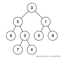 输入: root = [3,5,1,6,2,0,8,null,null,7,4], p = 5, q = 1