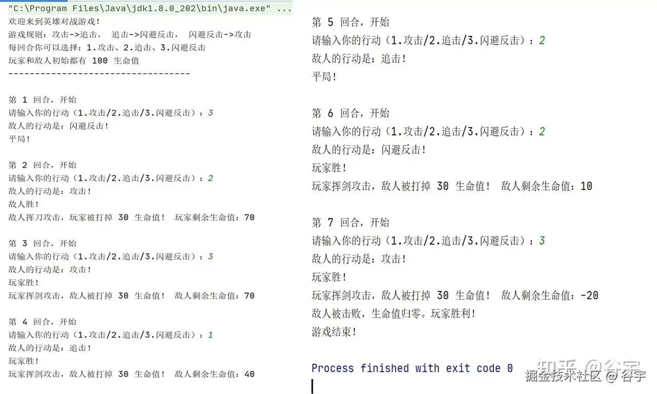 在运行“英雄对战”游戏时,我们重点关注了三种可能的游戏结果:玩家胜利和程序胜利。通过模拟玩家和程序的不同行动组合实现:当玩家的生命值降至零或以下时,程序会判定玩家失败;反之,当人机的生命值归零时,玩家获胜!