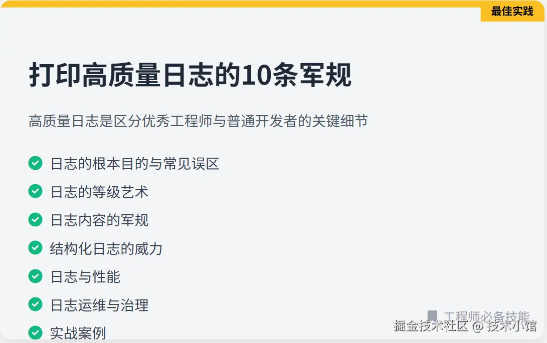 大多数日志的命运是:要么无人问津,要么在深夜被迫阅读。在你敲下每一行日志代码时,请想象凌晨三点被吵醒的自己(或者可怜的值班同事)需要从海量日志中找出线索。