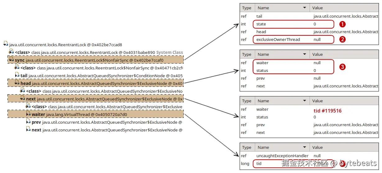 首先, exclusiveOwnerThread字段为null(2), 表明没有人拥有锁. 列表头部有一个“空”的 ExclusiveNode(3)(waiter 为 null 且 status 已清空), 随后是另一个 ExclusiveNode, 其 waiter 指向争夺锁的虚拟线程之一——#119516(4). 我们发现唯一清空 exclusiveOwnerThread 字段的位置是在 ReentrantLock.Sync.tryRelease() 方法中([源代码链接](https://github. com/openjdk/jdk21u/blob/jdk-21.0.3-ga/src/java.base/share/classes/java/util/concurrent/locks/ReentrantLock.java#L178)中. 在那里, 我们还设置了 state = 0, 与堆转储中看到的状态一致(1).