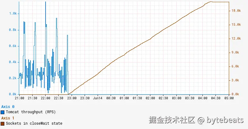 工程师向性能工程和JVM生态系统团队提交了多份独立报告, 反映间歇性超时和应用程序卡死的问题. 经深入分析, 我们发现这些问题存在一系列共同特征和症状. 所有受影响的应用程序均运行在Java 21环境下, 使用SpringBoot 3并通过嵌入式Tomcat处理REST接口的请求. 出现问题的实例会突然停止处理请求, 尽管这些实例的JVM仍处于运行状态. 该问题发作时的一个明显症状是 closeWait 状态下的套接字数量持续增加, 如下图所示: