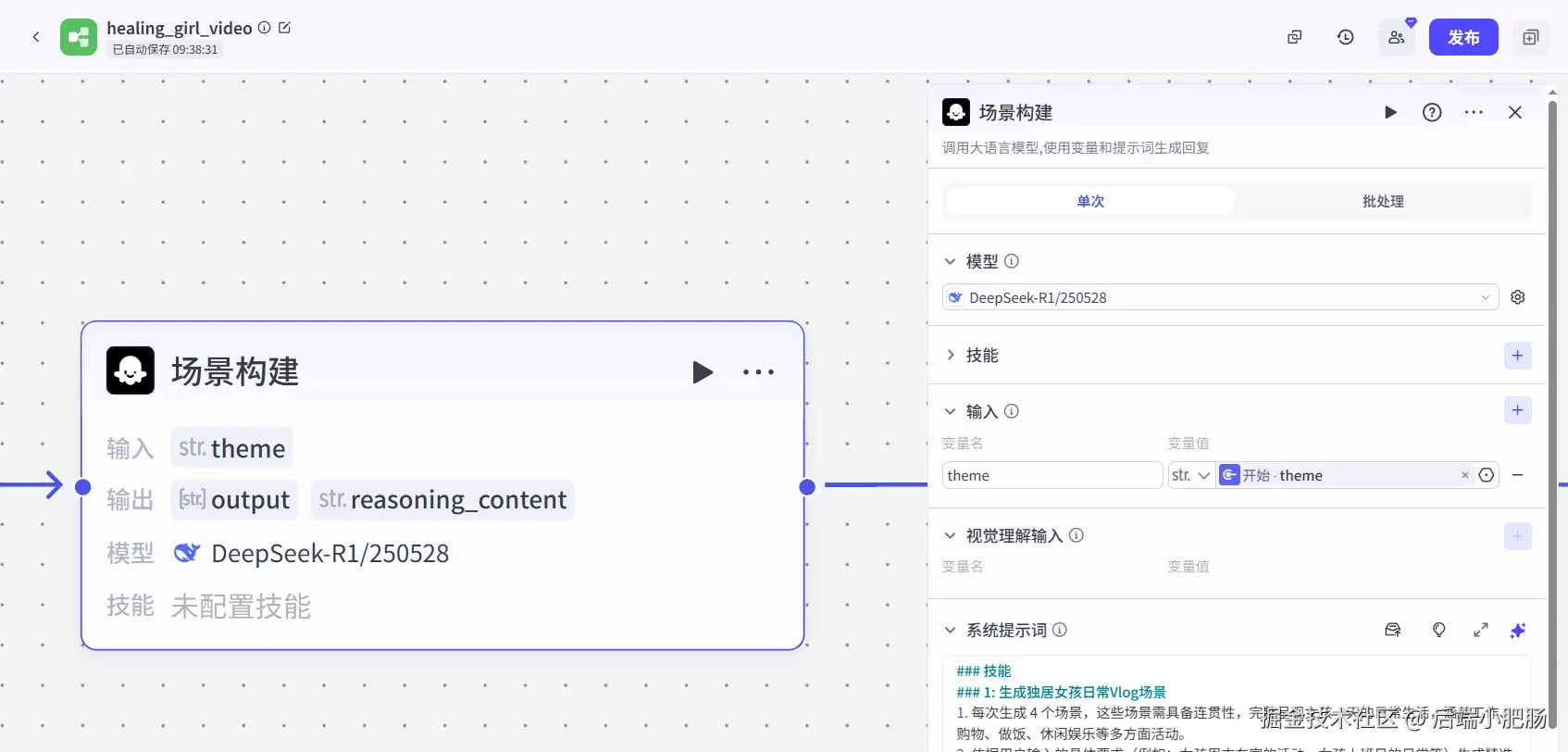 场景构建(大模型-DeepSeek R1250528): 这个节点的作用是基于用户提供的主题生成独居女孩日常Vlog场景,场景是后续生成图片和视频的基础。