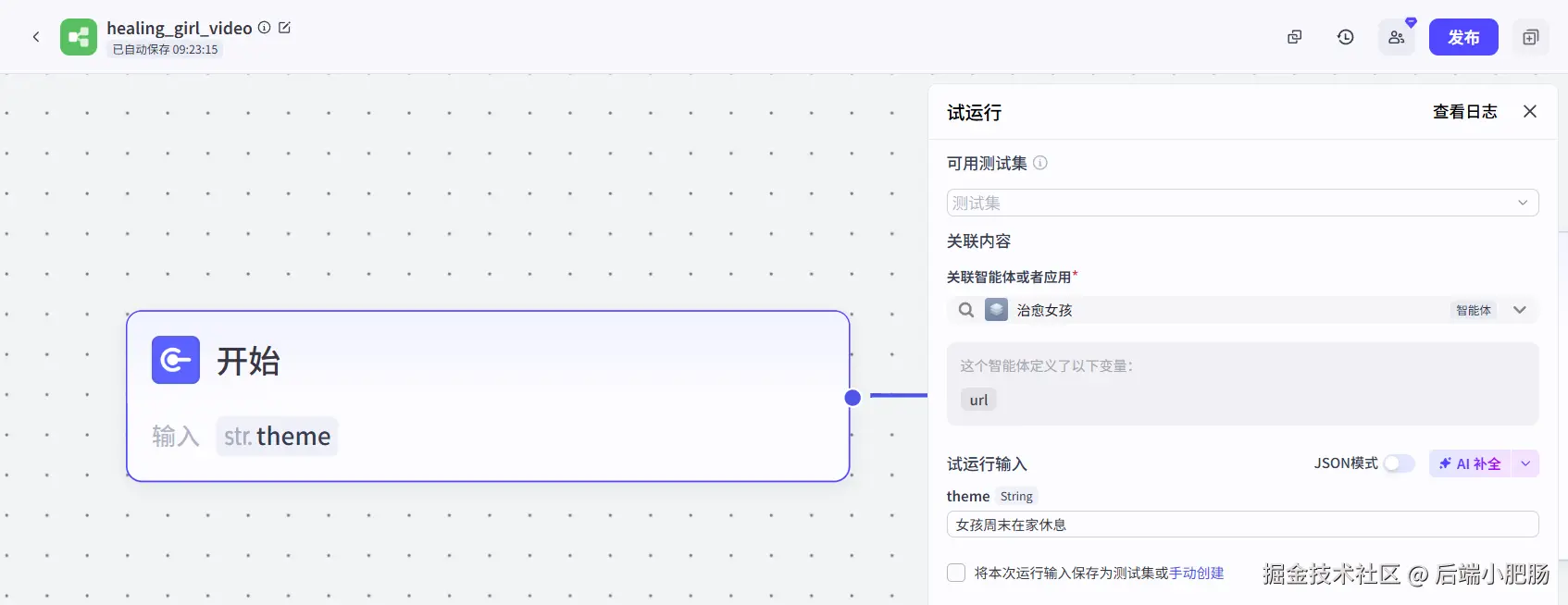 开始节点: 开始节点的输入参数为独居女孩Vlog视频的主题,在下图中我设置的主题为女孩周末在家休息。