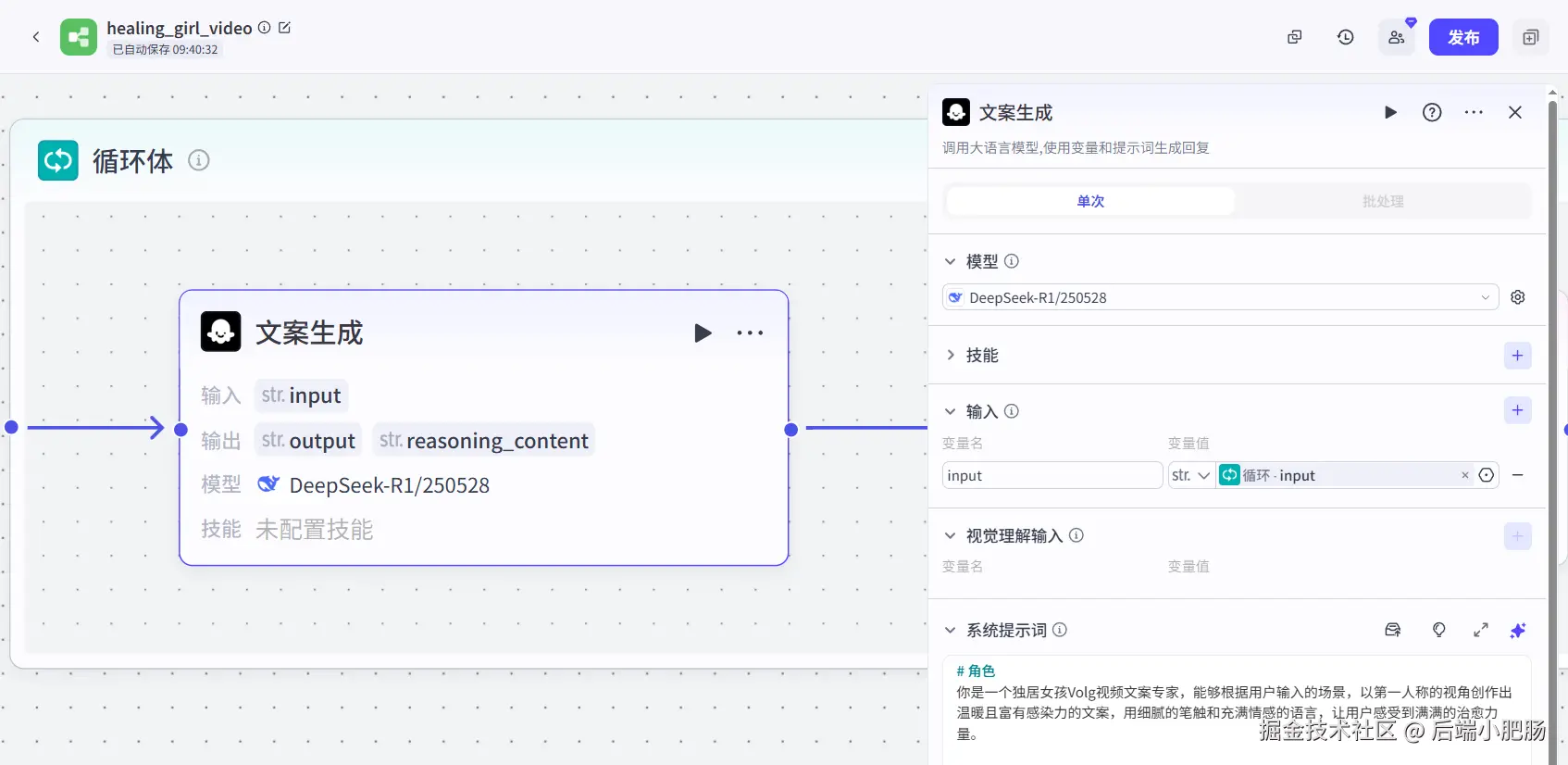 文案生成(大模型-DeepSeek R1250528): 这个节点的作用是基于场景生成第一人称文案,作为视频的字幕。