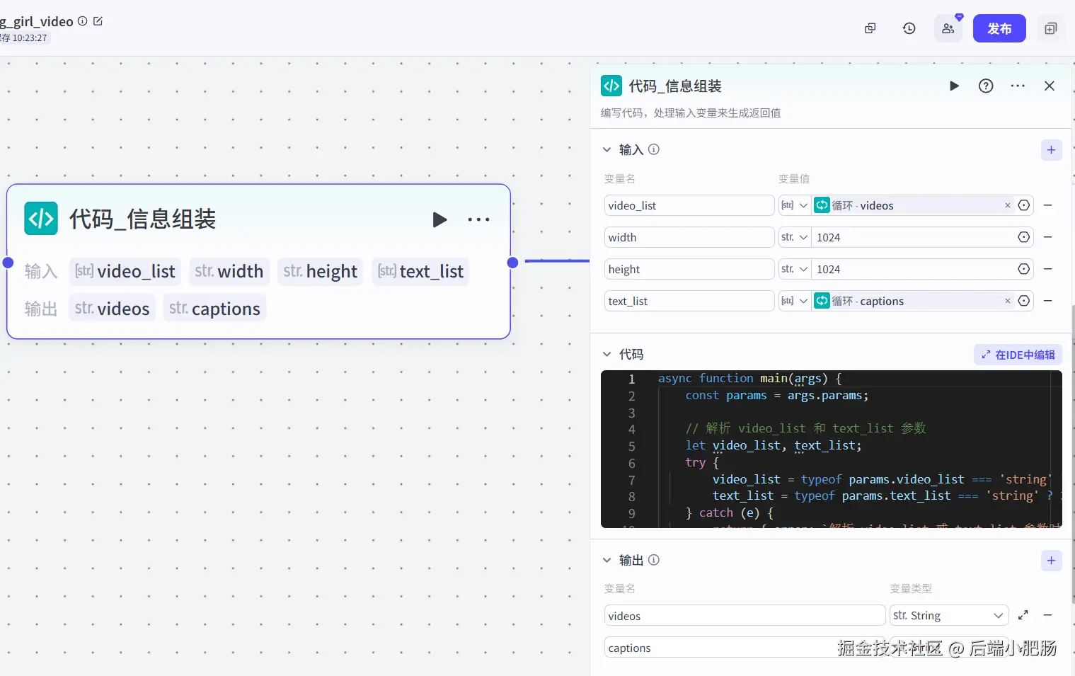 信息组装(代码): 这个节点的作用是将前面生成的视频和字幕素材组装为剪映小助手需要的格式,作为add_videos、add_captions插件的输入参数。