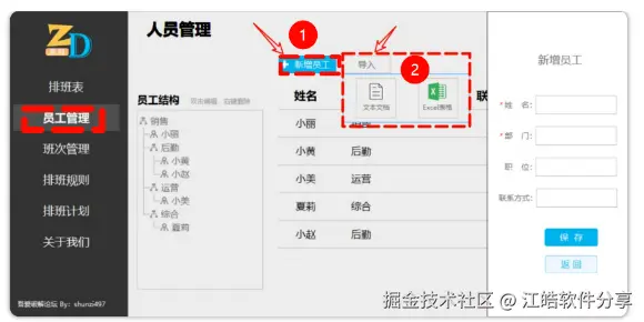 添加员工信息:支持手动录入,也可从文本或Excel表格中批量导入。