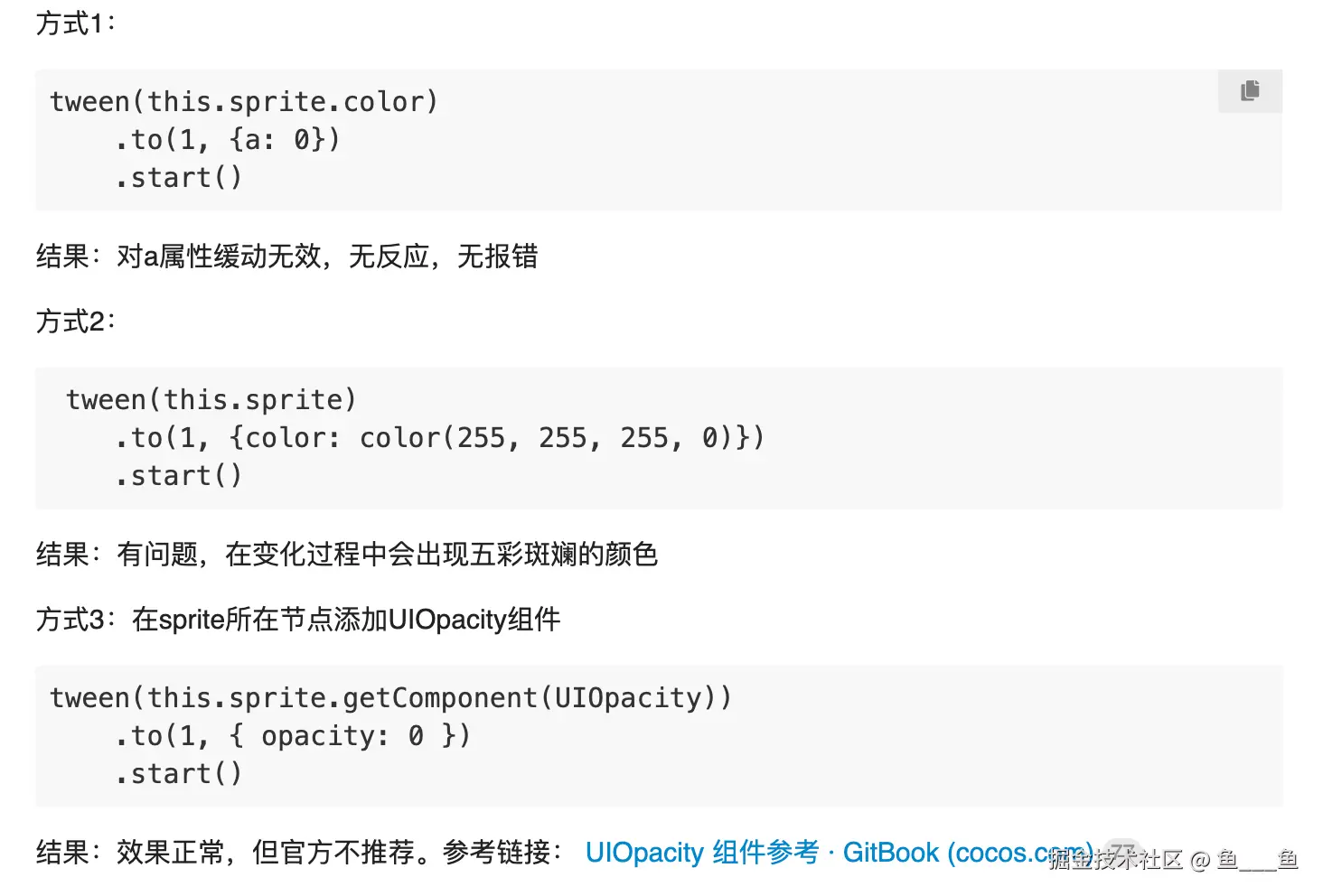 方式3: 目前是可以使用的,但是为何我们不推荐使用呢,这是由于我们在系统设计中认为组件本身有 color 值,那么可以直接控制 color 来完成效果,而 UIOpacity 是毫无必要的,且会造成两个数据来源,所以我们不推荐使用,但由于之前两个方式存在问题,可以暂时使用这种方式。