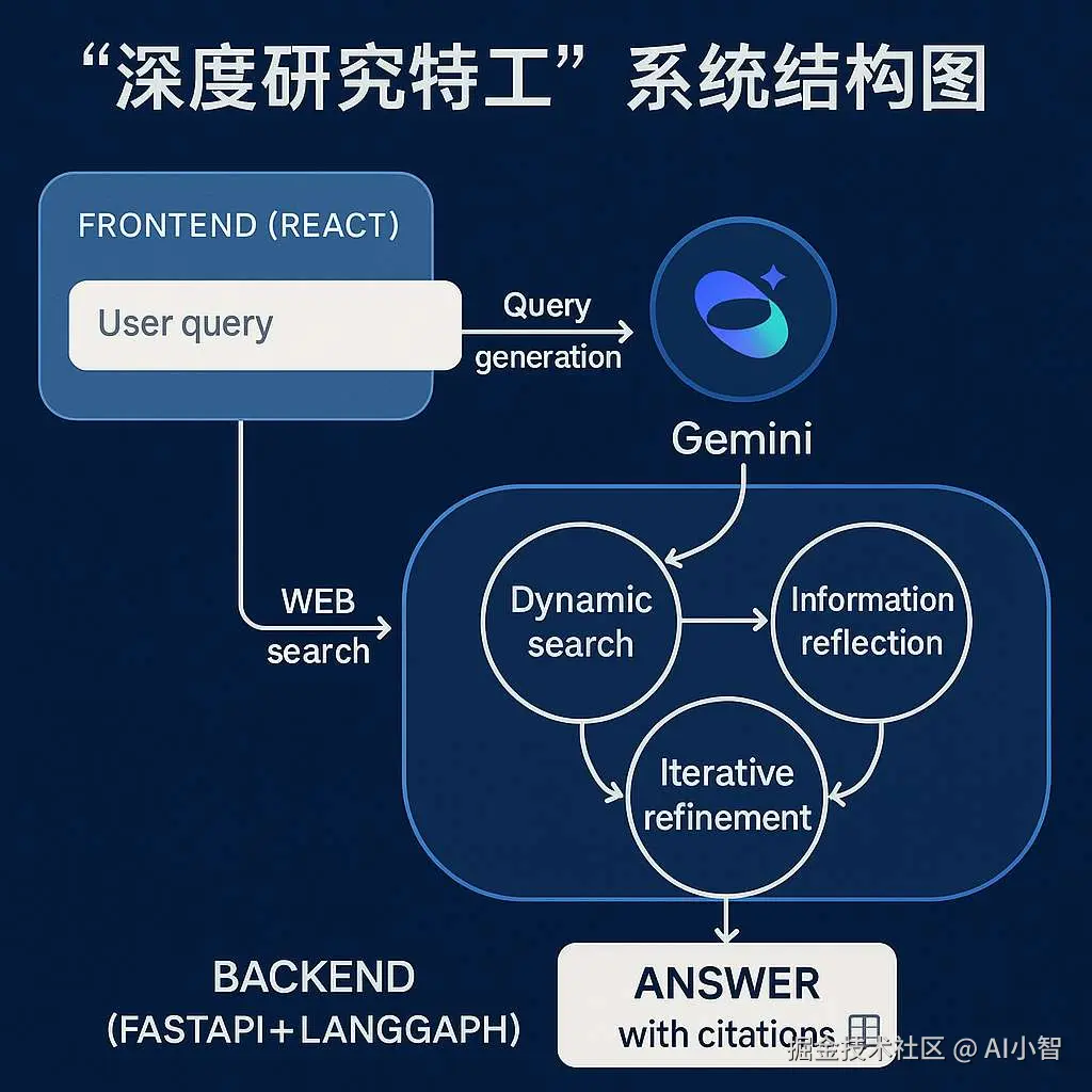 - Gemini 模型集成:Google 最新的多模态大模型系列,用于生成搜索词、反思信息质量及回答构建。