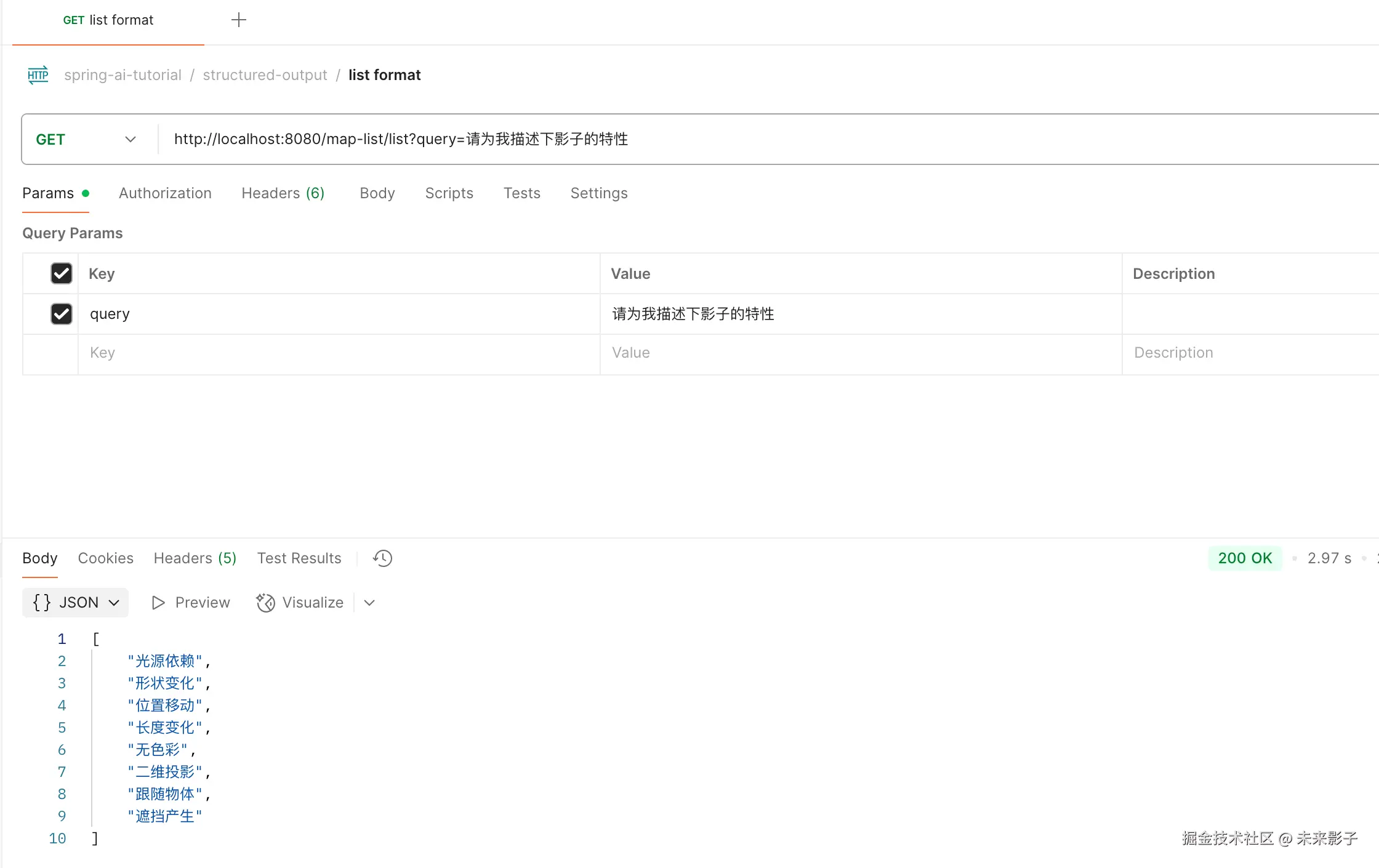 public List<String> list(@RequestParam(value = "query", defaultValue = "请为我描述下影子的特性") String query) {