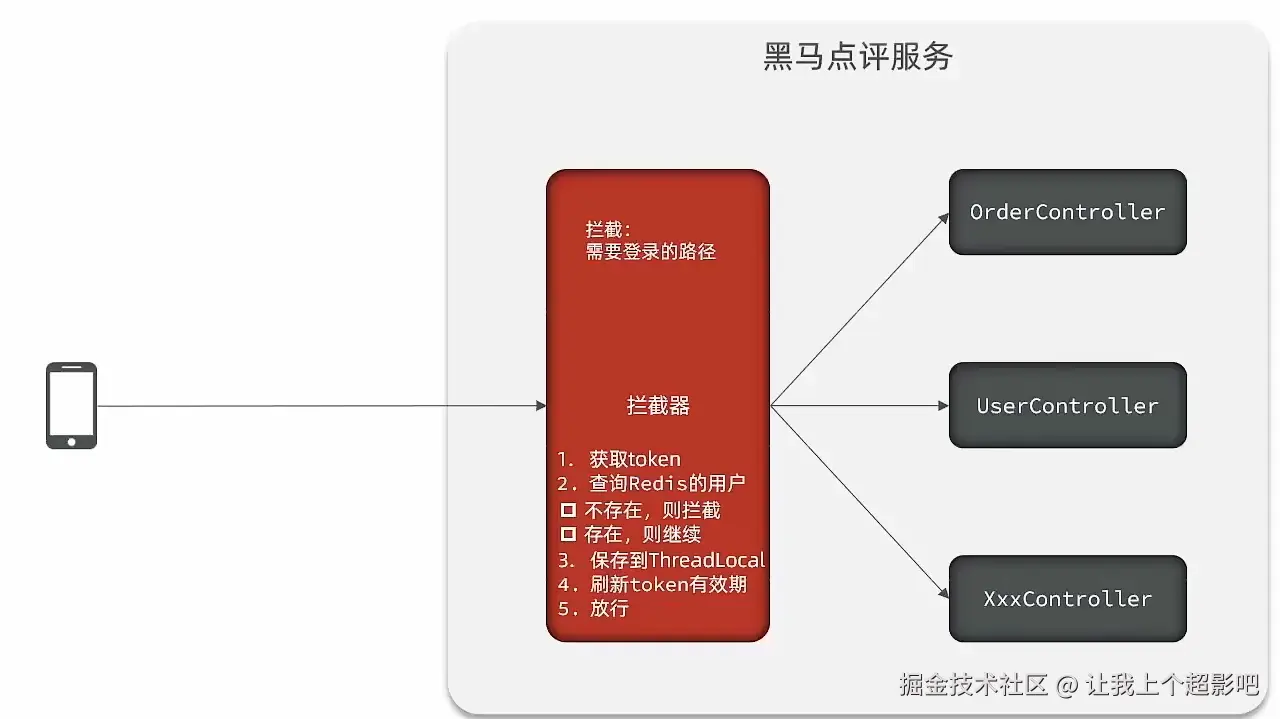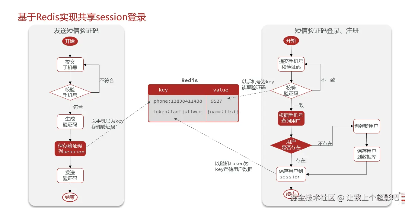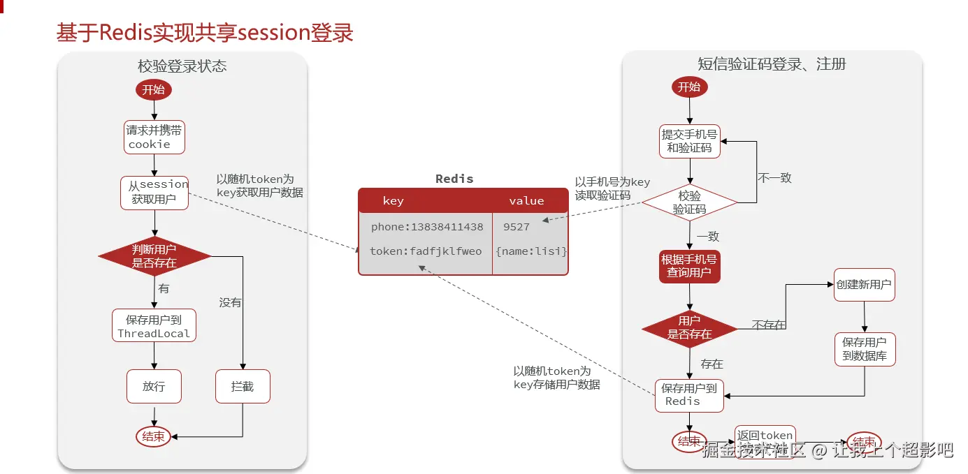 当注册完成后,用户去登录会去校验用户提交的手机号和验证码,是否一致,如果一致,则根据手机号查询用户信息,不存在则新建,最后将用户数据保存到redis,并且生成token作为redis的key,当我们校验用户是否登录时,会去携带着token进行访问,从redis中取出token对应的value, 判断是否存在这个数据,如果没有则拦截,如果存在则将其保存到threadLocal中,并且放行。