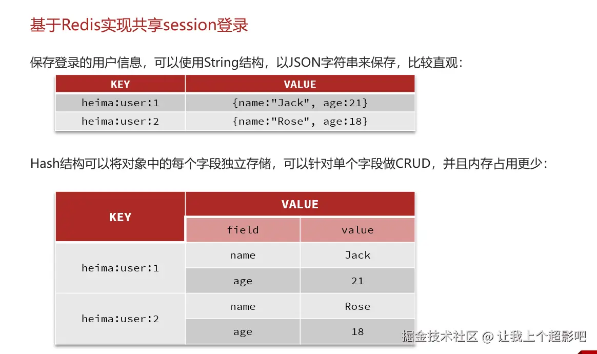 get heima:user:1命令看到{name:"Jack", age:21}全貌 。- 整体读写高效:存和取都是针对整个用户对象操作,Redis 处理单 key 的读写命令(如