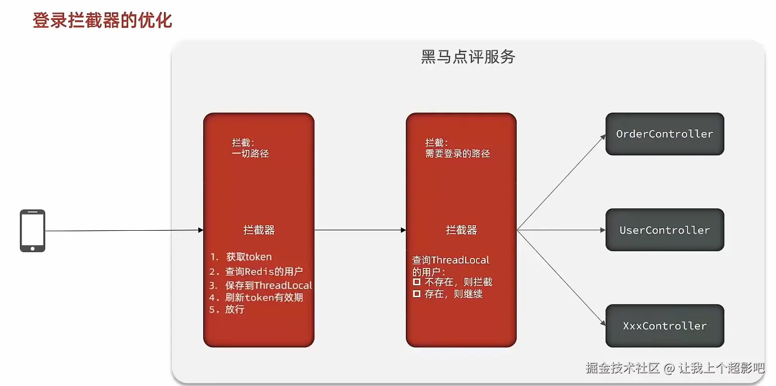 既然之前的拦截器无法对不需要拦截的路径生效,那么我们可以添加一个拦截器,在第一个拦截器中拦截所有的路径,把第二个拦截器做的事情放入到第一个拦截器中,同时刷新令牌,因为第一个拦截器有了threadLocal的数据,所以此时第二个拦截器只需要判断拦截器中的user对象是否存在即可,完成整体刷新功能。