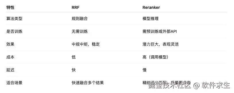 - 轻量场景(知识库问答、前端展示、离线处理):先用 RRF 提高召回质量;