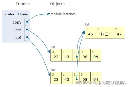 在上面的例子中,列表3中的第三个元素是一个可变的列表。当我们创建了浅拷贝list4后,4中的第三个元素仍然是指向内存中那个的引用。这就好比我们复制了一个装满东西的箱子(原始对象),得到了一个新的箱子(浅拷贝对象),虽然箱子本身是新的,但箱子里面某些可以变化的东西(如一个小盒子)在新箱子里仍然是指向原来那个小盒子的,而不是重新复制了一个小盒子。