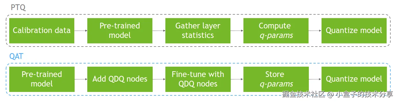 训练后量化 (PTQ):顾名思义,就是在模型训练完毕后再对模型进行量化处理。直接将已有模型的权重从浮点表示转换为定点的低精度整数表示即可。这种方法不需要重新训练模型,因而速度快、所需数据少,非常实用。当你已经有一个效果不错的模型,想让它运行更快、更省资源时,PTQ是很好的选择。然而,PTQ相当于事后压缩模型,难免出现一些性能下降,即模型精度可能有所降低。