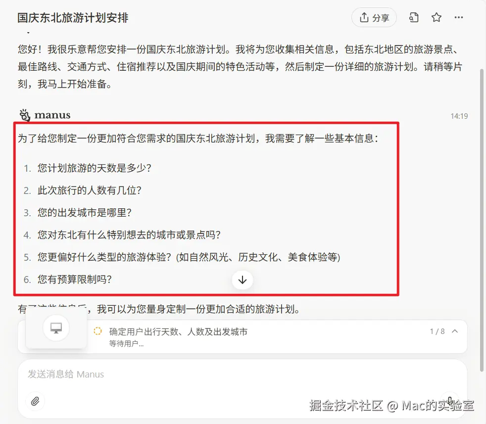这时我才感觉到不一样,它好像是真的想给我安排一个专属的计划。在我对这些问题一一回答后,Manus开始制定计划了。