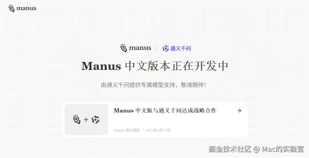 首先需要说明的一点是下面演示使用的Manus均为国际版。咱们国内直接访问的话会显示中文版正在开放中,将会由通义千问提供模型支持,大家可以期待一手。