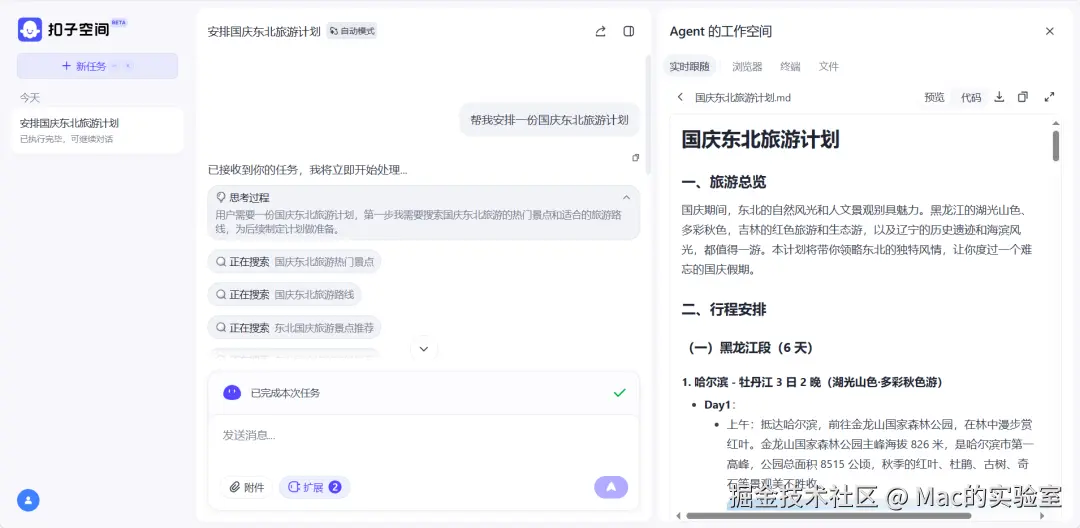 莫理提供的信息很简单:“帮我安排一份国庆东北旅游计划”,咱们先看看扣子空间这边。