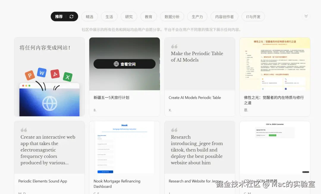 在提问栏下面我们可以能看见许多国内外用户分享出来的由Manus制作的任务、网站。