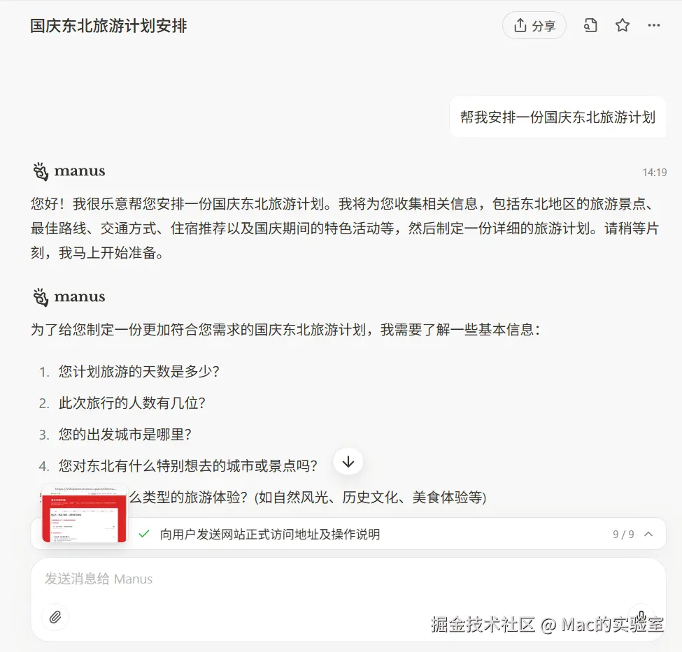再来看看Manus,同样的信息发送给它本以为直接等结果就完了。没想到它居然反问我了