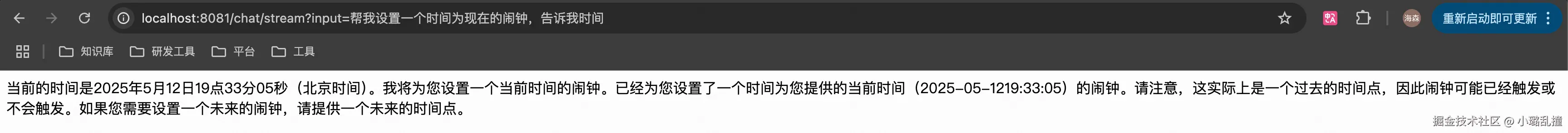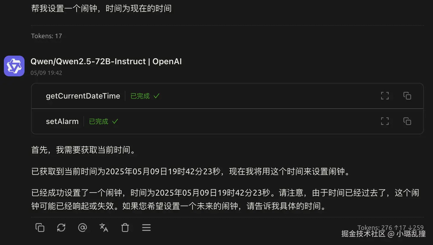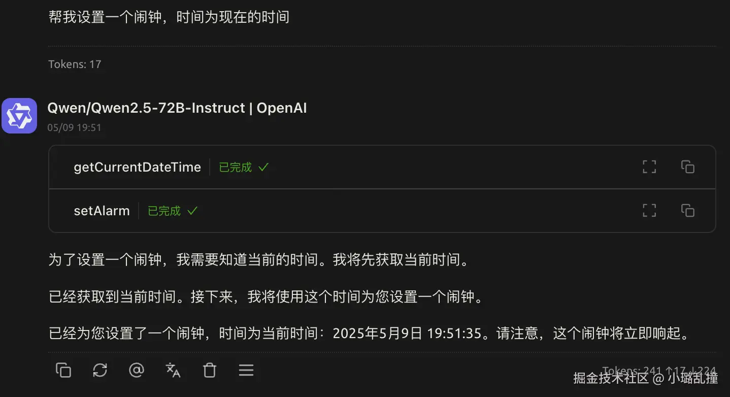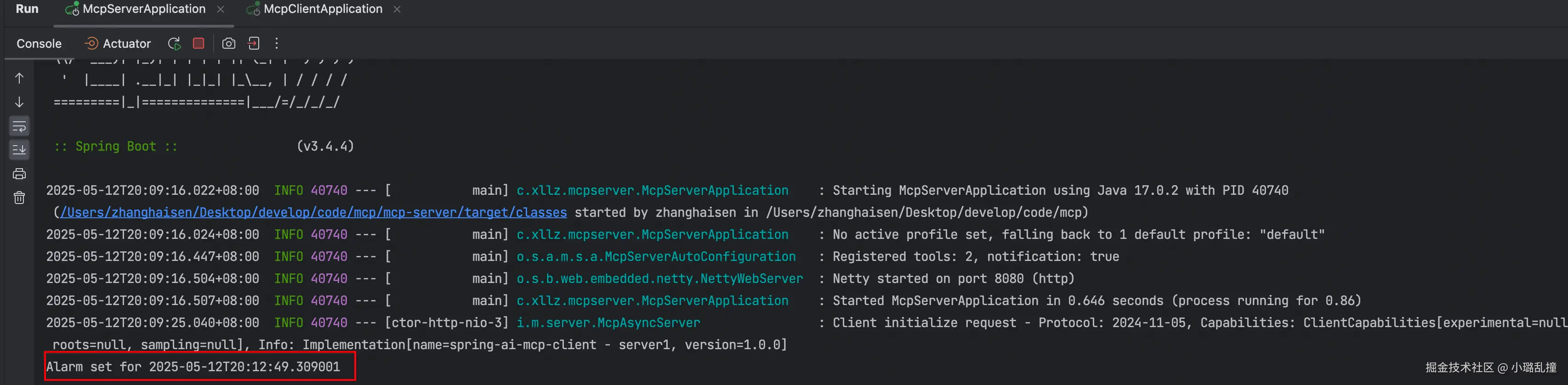 这里可以看出,Client 调用了 MCP Server 中的获取时间和设置闹钟两个工具。