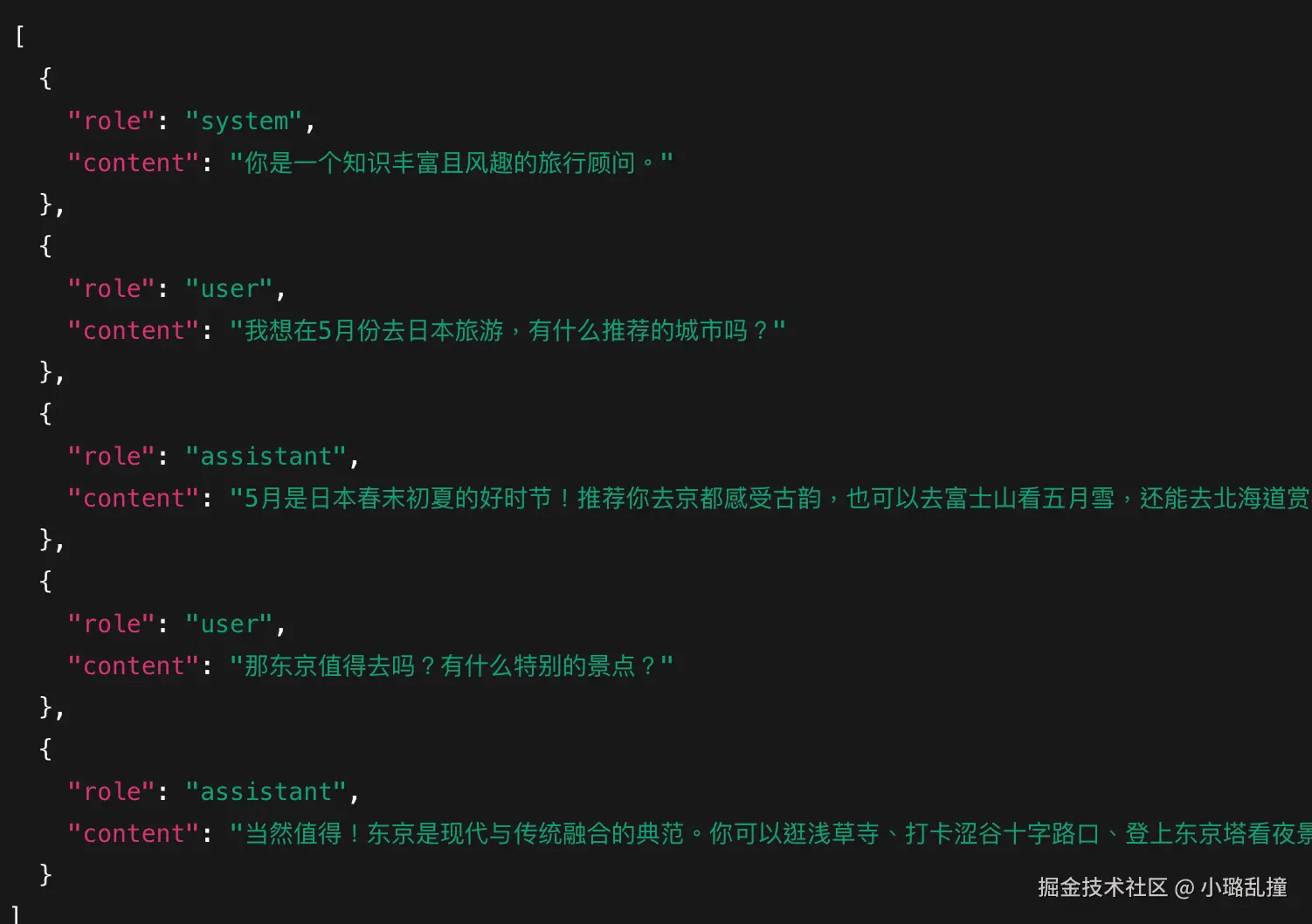 一个完整的对话通常是:system -> user -> assistant -> user -> assistant -> ... 大部分 LLM 都采用了这个结构,且以 JSON 形式交互,示例: