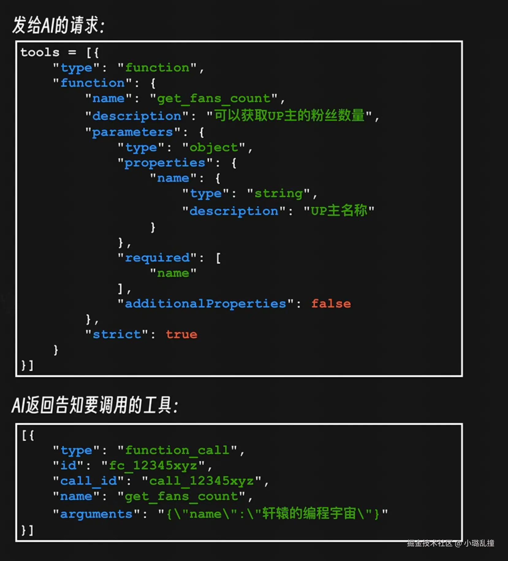 过去的大模型遵循指令的能力不强,即使告诉了它说明书,它也很可能并不会按照说明书上的方式和你对接,这就会使得中介程序无法完成后续的事情。针对这一问题,OpenAI 提出了 Function Call 技术,其中专门定义了规范,用于标准化过程。具体来说,Function Call 使用 JSON 格式来描述工具说明书和大模型返回的结果,并定义了专门的字段来指示各个信息,如使用哪些工具、使用什么参数等。例如: