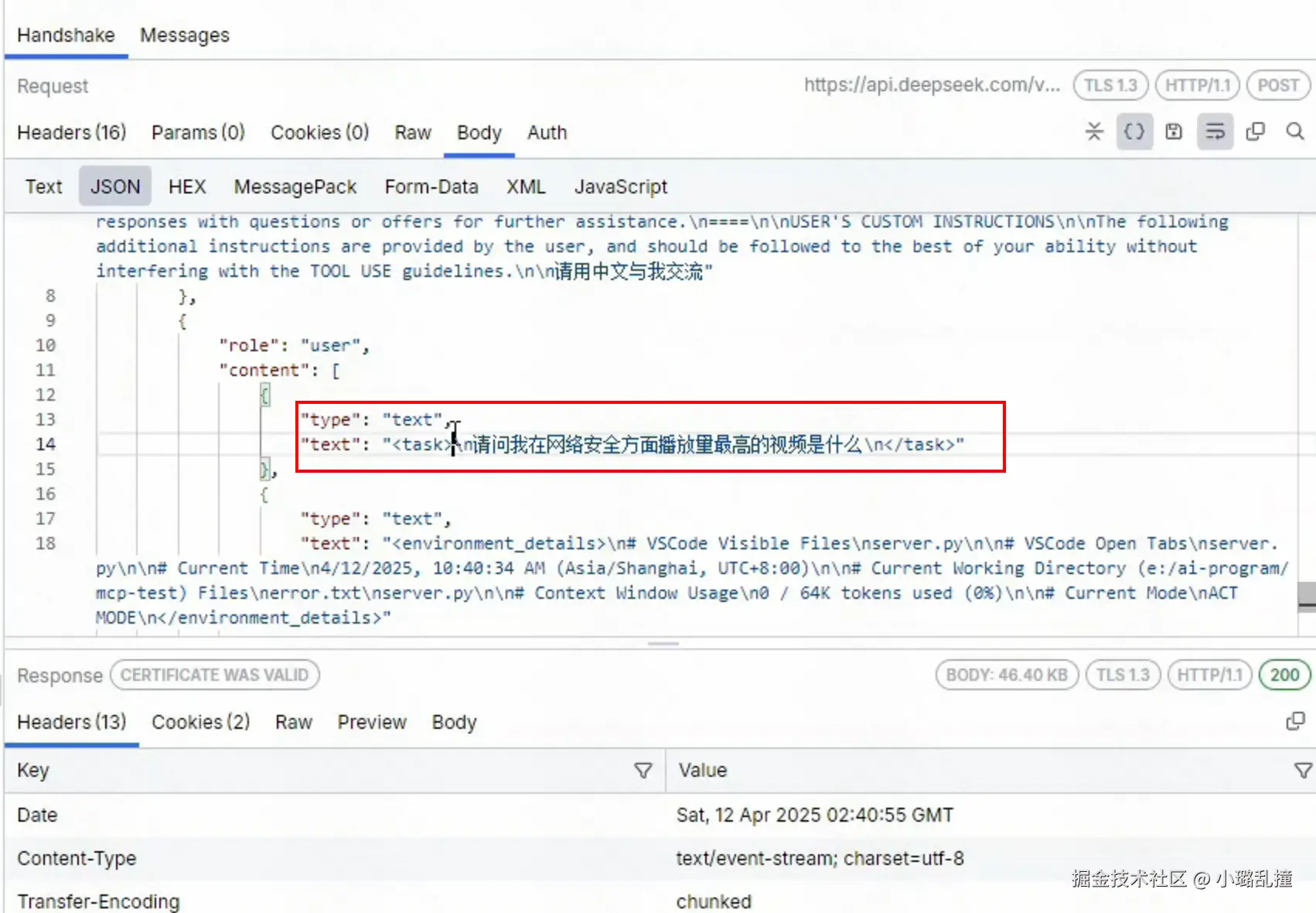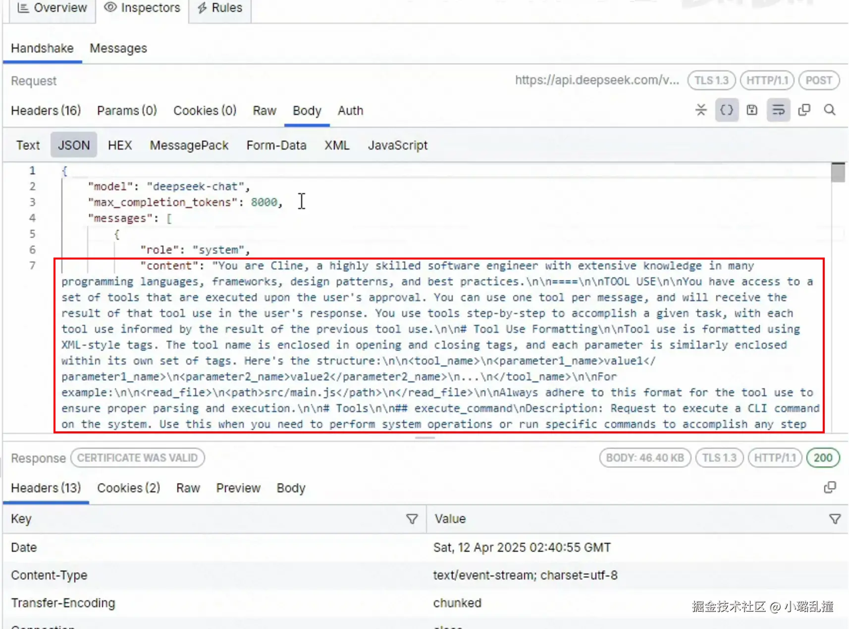 先来看看下面抓的包,这是 Host 向 LLM 发起请求时的包内容: