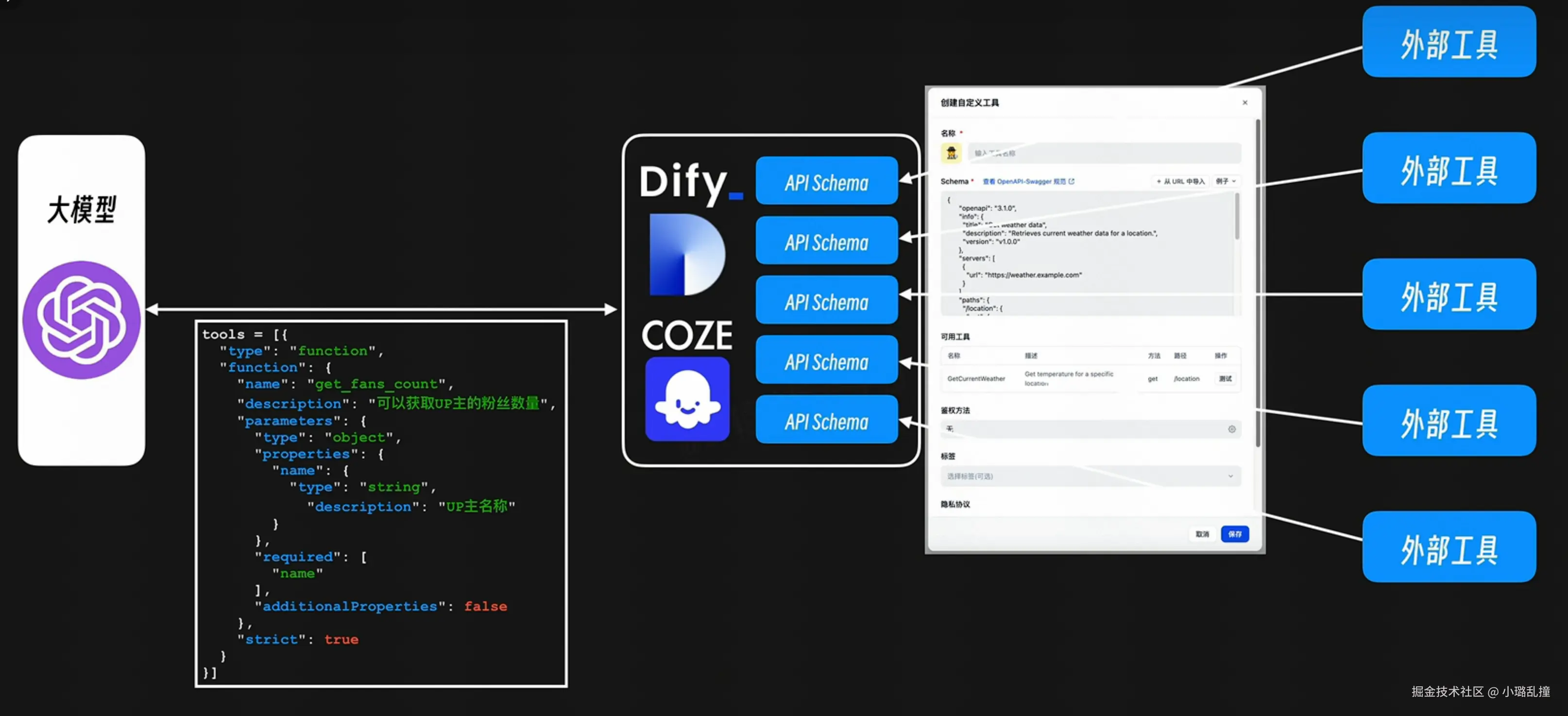但是,这种模式也存在着一些问题,例如有时大模型不会按照说明书里的方式返回我们需要使用的工具和参数,以及如果外部程序比较复杂,我们需要编写很长的 prompt,这不仅会耗费大量的 token,还可能会使得大模型无法准确解析出说明书内容。
